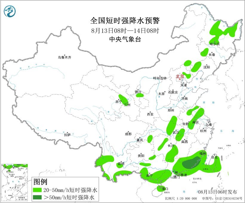 預計8月13日08時至14日08時,內(nèi)蒙古東南部、東北地區(qū)北部和西部、蘇皖北部、華南東部等地的部分地區(qū)將有8級以上雷暴大風或冰雹天氣,其中,黑龍江東北部、遼寧西部、福建南部、廣東東部等地的部分地區(qū)將有10級以上雷暴大風,最大風力可達11級以上;內(nèi)蒙古東南部、東北地區(qū)北部和西部、江淮西部和北部、江漢、江南北部和西部、西南地區(qū)東部和南部、華南等地的部分地區(qū)將有小時雨量大于20毫米的短時強降水天氣,其中,福建南部、廣東東部等地的部分地區(qū)小時雨量大于50毫米,最大可達70毫米以上。