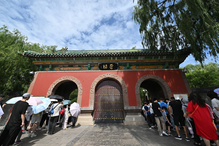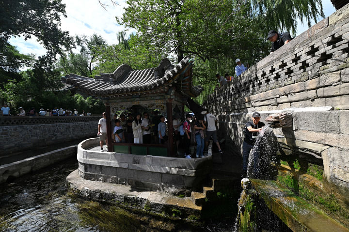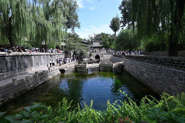 2025年8月7日,游客在晉祠難老泉排隊觀泉。新華社記者 詹彥 攝
