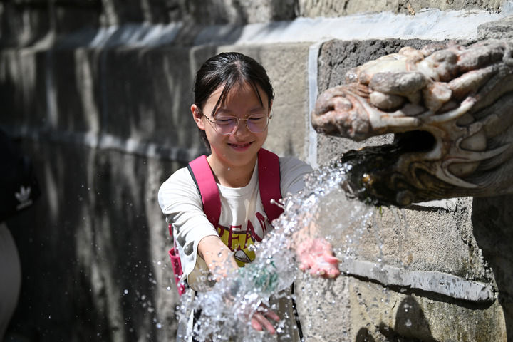 2025年8月7日,一名游客在晉祠難老泉感受泉水的清冽。新華社記者 詹彥 攝