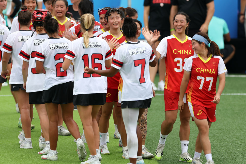 8月9日,中國棍網(wǎng)球隊球員與加拿大隊球員賽后擊掌致意。新華社記者 陳斌 攝