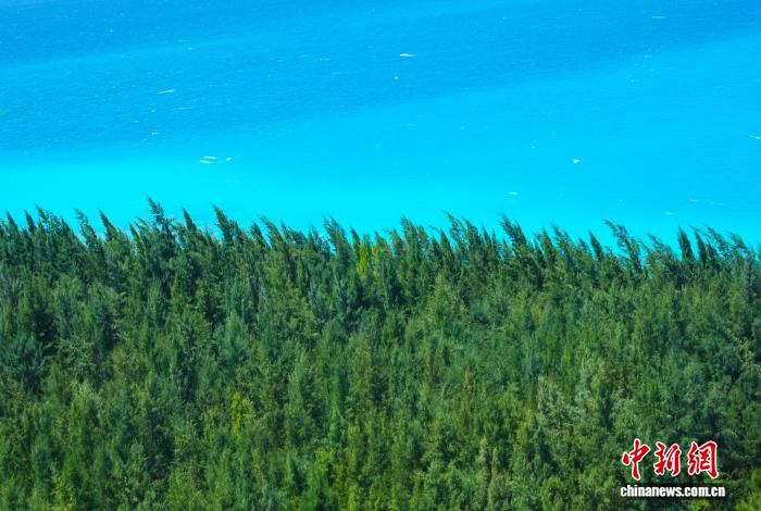 這是2025年6月29日在南海某島礁拍攝到的畫面,礁上茂密的綠色植被取代了原本白茫茫的礁砂,與周邊蔚藍色海面形成鮮明對比?!埓笥?攝