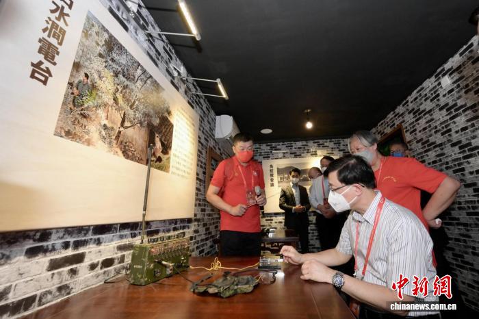 2022年9月3日,香港特區(qū)行政長官李家超(右一)出席香港沙頭角抗戰(zhàn)紀念館揭幕典禮時,在紀念館“石水澗電臺”展區(qū)體驗抗戰(zhàn)時期電臺工作。(資料圖)(香港特區(qū)政府新聞處供圖)
