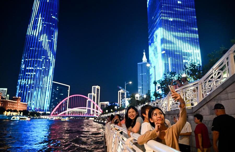 2025年8月11日,游客在天津海河岸邊拍照打卡。新華社記者 趙子碩 攝