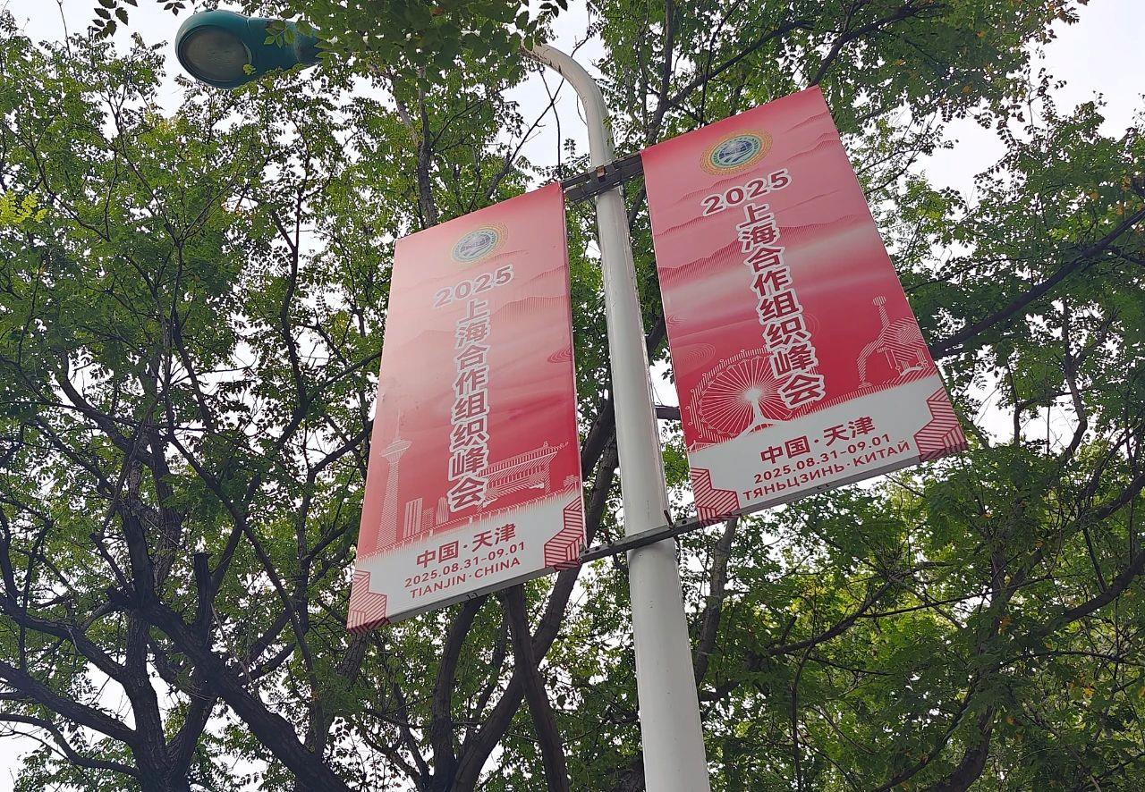 走進天津,會發(fā)現(xiàn)體現(xiàn)上合元素的旗幟已經(jīng)掛滿天津主干道路兩側(cè),賞心悅目的花籃也點綴在大街小巷。