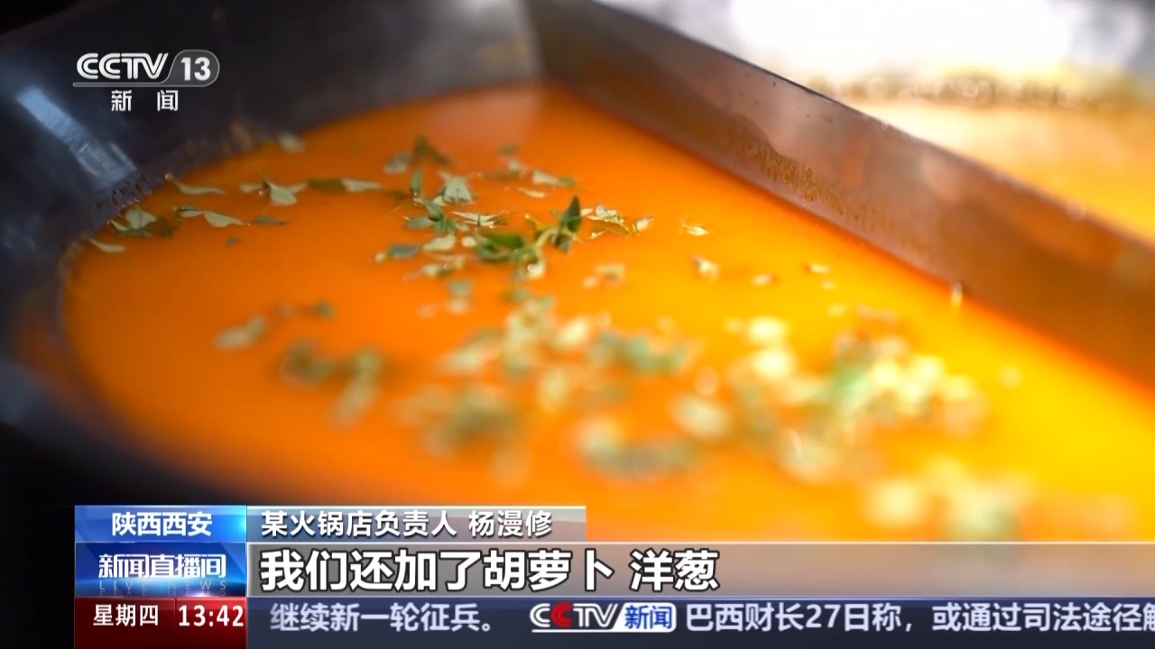 某火鍋店負責(zé)人 楊漫修:我們這個番茄鍋更像是西餐里面的番茄濃湯,比如說我們在做料的時候除了番茄以外,我們還加了胡蘿卜、洋蔥、歐芹、百里香。