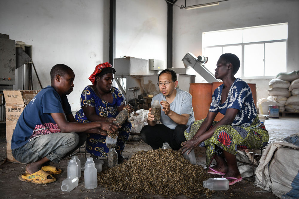 2024年8月13日,在盧旺達(dá)南方省胡耶區(qū)的中國援盧農(nóng)業(yè)技術(shù)示范中心,菌草專家陳曉斌(右二)與當(dāng)?shù)剞r(nóng)民一起制作菌種培養(yǎng)料。新華社記者 韓旭 攝