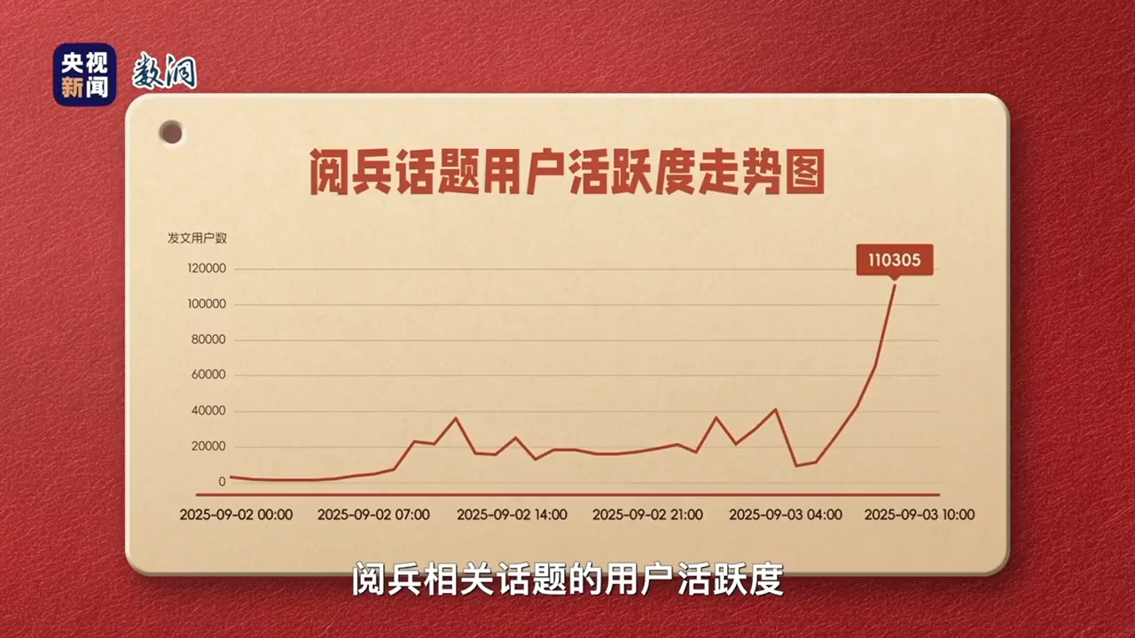 數(shù)據(jù)曲線和觀眾的情緒重疊上揚(yáng),開始的瞬間,閱兵相關(guān)話題的用戶活躍度飆升到前一天最高值的三倍。