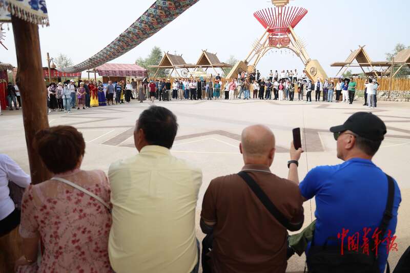 9月9日,新疆巴州尉犁縣羅布人村寨景區(qū),游客等待演員登場演出。中青報(bào)·中青網(wǎng)記者 王鑫昕/攝