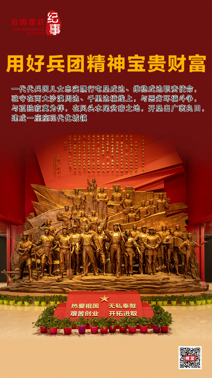 ◇2022年7月,習(xí)近平總書記在新疆考察時來到新疆生產(chǎn)建設(shè)兵團(tuán)八師石河子市,參觀新疆兵團(tuán)軍墾博物館。會見兵團(tuán)老中青三代建設(shè)者代表時,他強(qiáng)調(diào),新疆生產(chǎn)建設(shè)兵團(tuán)為推動新疆發(fā)展、增進(jìn)民族團(tuán)結(jié)、維護(hù)社會穩(wěn)定、鞏固國家邊防作出了不可磨滅的貢獻(xiàn)。兵團(tuán)人鑄就的熱愛祖國、無私奉獻(xiàn)、艱苦創(chuàng)業(yè)、開拓進(jìn)取的兵團(tuán)精神,是中國共產(chǎn)黨人精神譜系的重要組成部分,要用好這些寶貴財富。