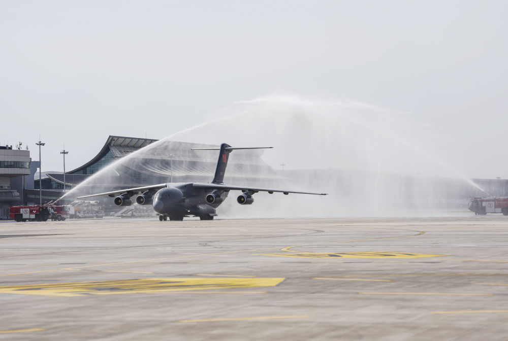 9月12日,第十二批在韓中國人民志愿軍烈士遺骸回國。這是在沈陽桃仙國際機場,接運烈士遺骸回國的運-20專機通過水門。新華社記者 潘昱龍 攝