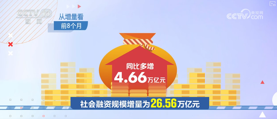 從增量看,前8個月,社會融資規(guī)模增量為26.56萬億元,同比多增4.66萬億元。