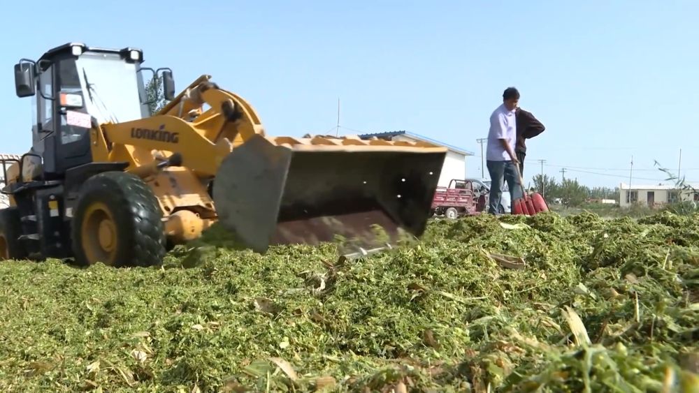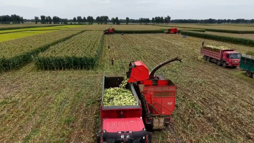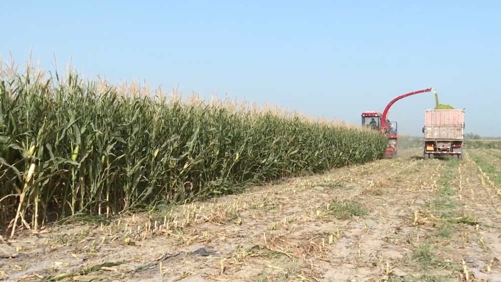 新疆巴音郭楞蒙古自治州焉耆縣的1.5萬(wàn)畝青貯玉米迎來豐收。在永寧鎮(zhèn)九號(hào)渠村,大型青貯收割加工機(jī)將一株株玉米從根部割斷,粉碎后拋入集草車。