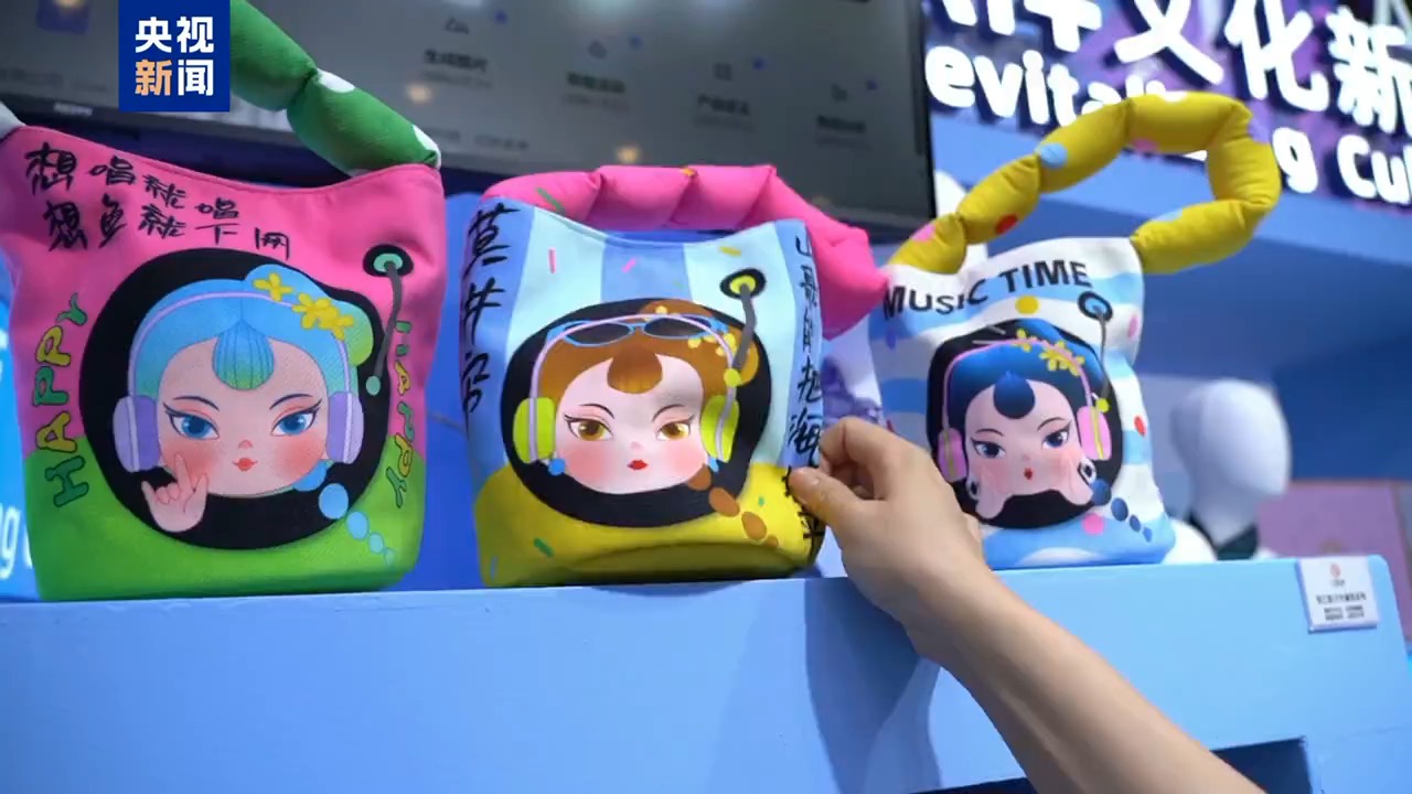 總臺央視記者 張歆:在人工智能專館,除了有炫酷的機器人,我們可以看到,這個水桶包就是由人工智能提供靈感的,以劉三姐為IP形象的文創(chuàng)產(chǎn)品。那么這個水桶包還引用了劉三姐山歌的內容,“山歌能把海填平”。