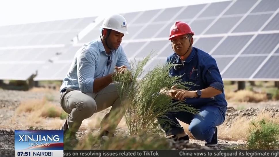 外籍主持人林肯探訪了全球最大的“草光互補”光伏基地——阿合雅光伏產業(yè)園。這片由181萬塊光伏板組成的藍色海洋,占地493公頃,相當于700個標準足球場。不僅能夠提供滿足約43萬人全年用電需求,還兼具治沙功效。中國華能集團烏什光伏電站負責人周博表示,這類光伏設施能夠穩(wěn)固土壤、防止侵蝕,板面凝結的水珠還可灌溉下方土地,支持植物持續(xù)生長?!案瓯谄孥E”的背后,是國家實現“雙碳”目標而推動的生態(tài)與能源的“雙向奔赴”。