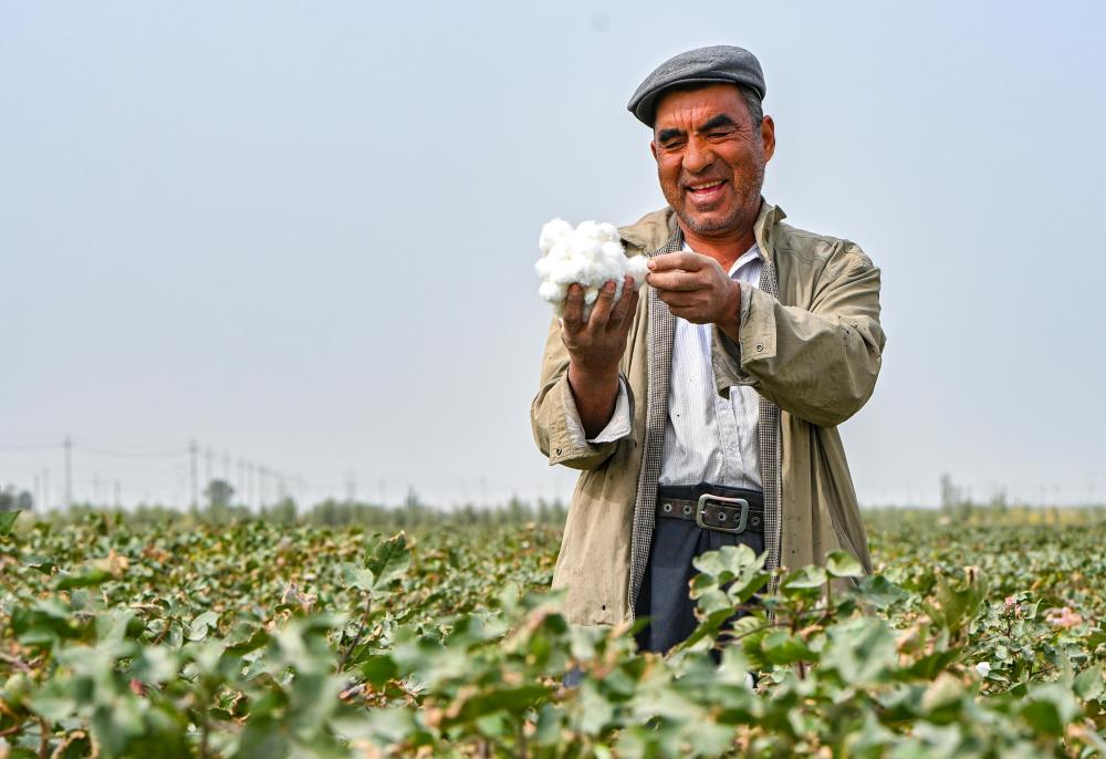 9月19日,尉犁縣達(dá)西村二組村民艾合買提·吐爾遜在棉田里查看棉花。