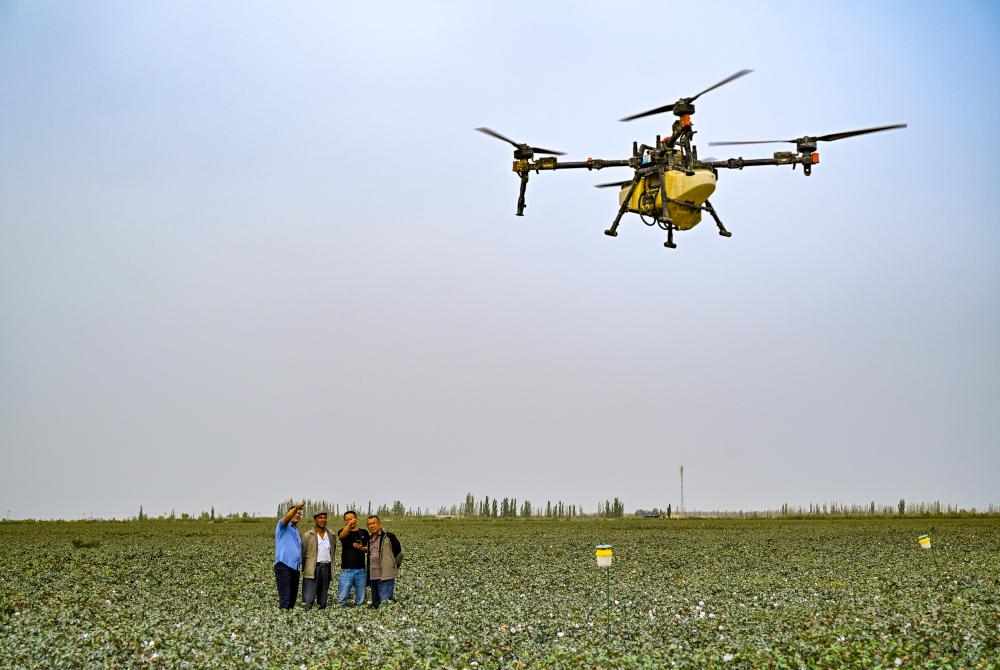 9月19日,極飛超級棉田負(fù)責(zé)人艾海鵬(右二)在尉犁縣的示范棉田里為達(dá)西村村民進(jìn)行智能無人機(jī)灑藥培訓(xùn)。無人化智慧農(nóng)場應(yīng)用農(nóng)業(yè)無人機(jī)、農(nóng)業(yè)無人車、遙感無人機(jī)、農(nóng)機(jī)自駕儀等系列物聯(lián)設(shè)備實施“水肥一體化”管理,農(nóng)民用一部手機(jī)即可操作智能設(shè)備完成多項田間管理工作。