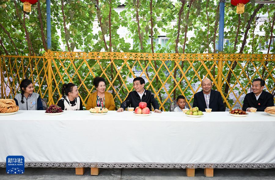 9月25日下午,受習近平總書記囑托,中共中央政治局常委、全國政協(xié)主席、中央代表團團長王滬寧帶領中央代表團部分成員在巴音郭楞蒙古自治州庫爾勒市看望慰問當?shù)馗髯甯刹咳罕姟_@是王滬寧和中央代表團部分成員在庫爾勒市阿瓦提鄉(xiāng)吾夏克鐵熱克村了解鄉(xiāng)村產業(yè)發(fā)展和群眾生產生活情況。新華社記者 張領 攝