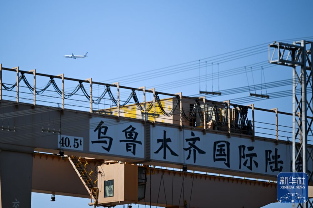 ↑9月15日,一架飛機從烏魯木齊國際陸港區(qū)上空飛過。