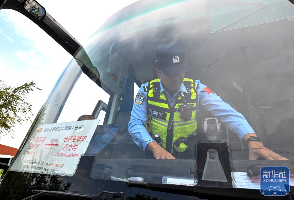 ↑9月17日,巴克圖出入境邊防檢查站的移民管理警察在巴克圖口岸查驗經(jīng)由該口岸出境前往哈薩克斯坦的客車。