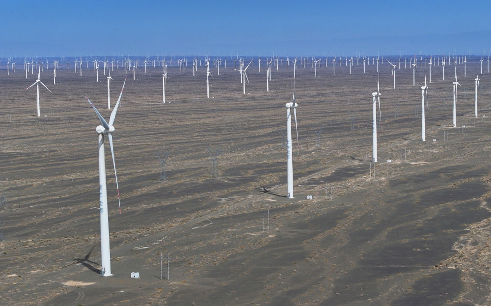 在新疆哈密地區(qū)巴里坤哈薩克自治縣拍攝的三塘湖風(fēng)電場(chǎng)(4月27日攝,無人機(jī)照片)。