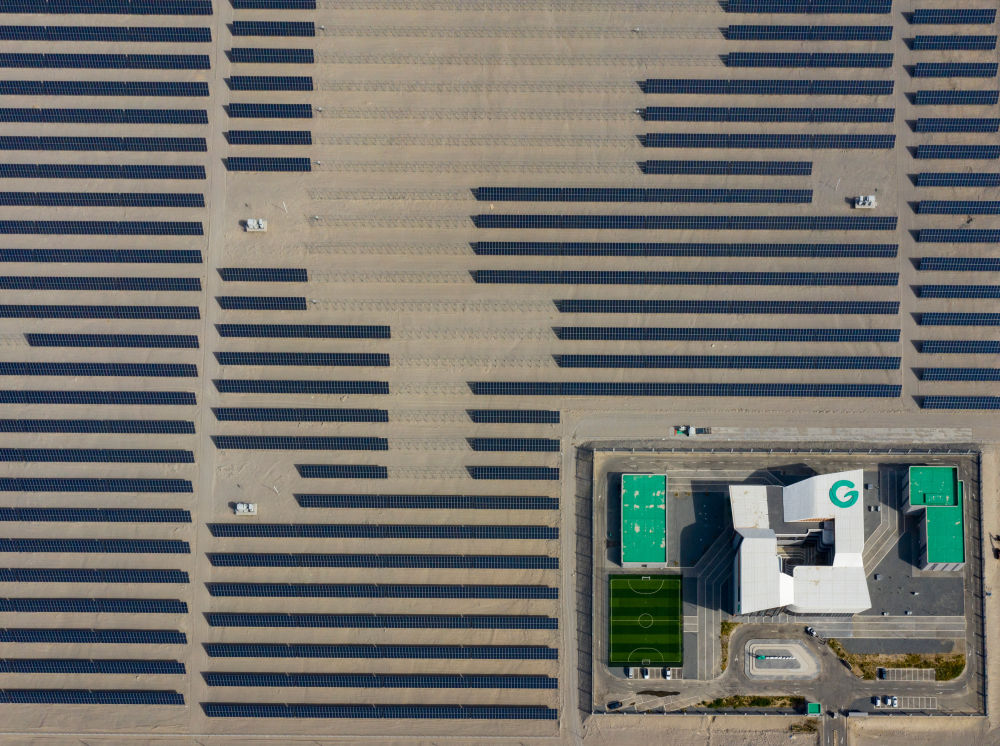 9月22日在新疆巴音郭楞蒙古自治州若羌縣拍攝的中國綠發(fā)新疆中綠電若羌400萬千瓦光伏項(xiàng)目(無人機(jī)照片)。該項(xiàng)目每年可發(fā)電69.08億千瓦時(shí),滿足南疆200萬戶家庭用電需求,減排208.24萬噸煤耗。
