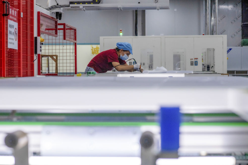 9月22日,工人在新疆巴音郭楞蒙古自治州若羌縣的國晟企誠新能源有限公司對(duì)光伏電池片進(jìn)行疊層返修。