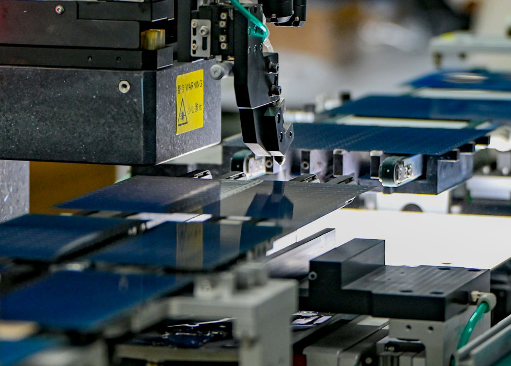 9月22日,在新疆巴音郭楞蒙古自治州若羌縣的國晟企誠新能源有限公司,全自動(dòng)劃片機(jī)在切割光伏電池片。