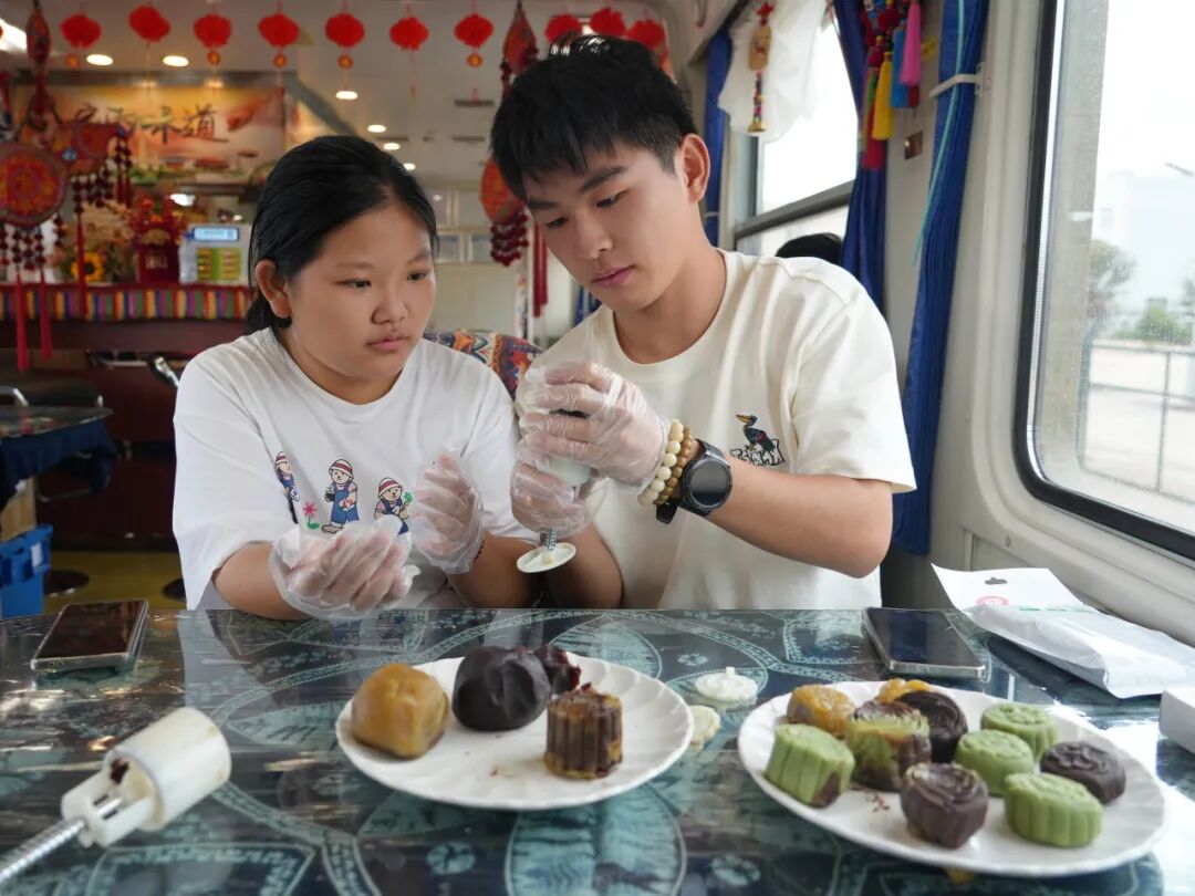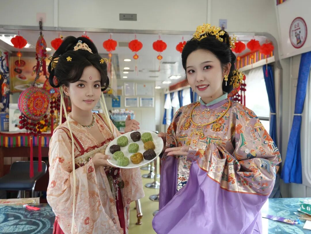 除了歌舞與燈謎,列車工作人員還精心準備了互動體驗環(huán)節(jié)。旅客圍坐在一起,親手制作月餅、拼裝手工燈籠。工作人員還為參與活動的旅客送上書簽,大家提筆寫下對家人的中秋祝愿,字里行間滿是牽掛與祝福?;顒游猜?,身著漢服的列車工作人員端來一盤香甜的滇式月餅,邀請旅客品嘗。