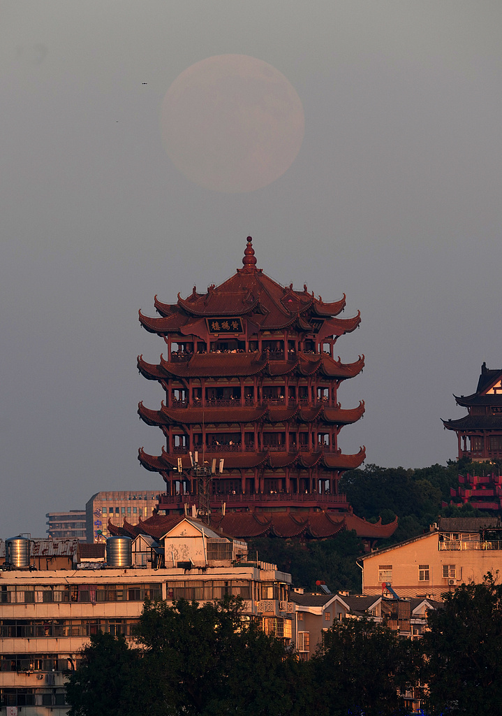 中秋佳節(jié),一輪明月從夕陽和薄霧下的武漢黃鶴樓上緩緩升起,吸引了眾多市民前來觀看。