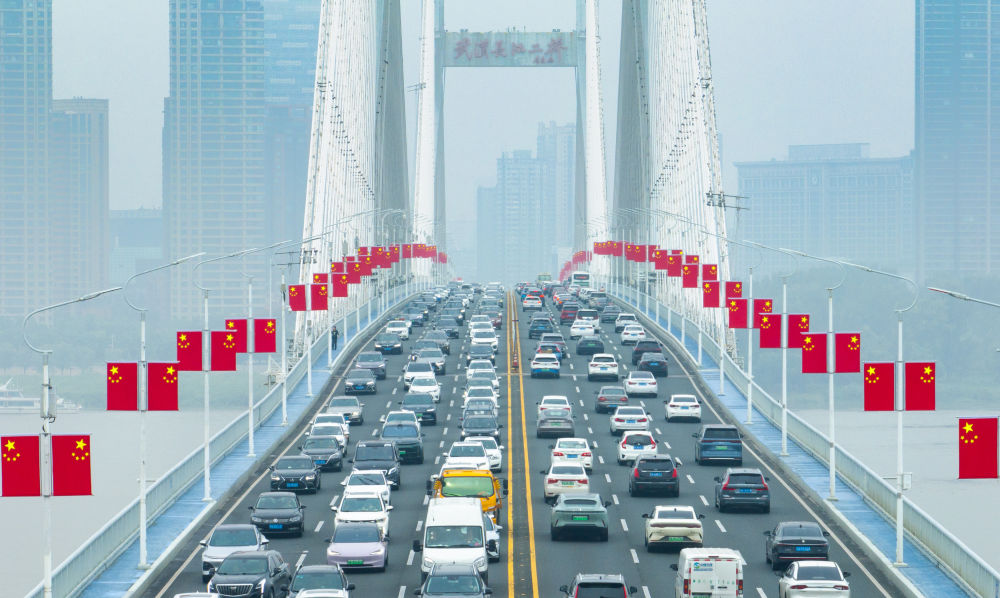 國慶假期第一天,各地迎來出行高峰。這是車輛行駛在湖北省武漢長(zhǎng)江二橋上(無人機(jī)照片,10月1日攝)。新華社記者 肖藝九 攝