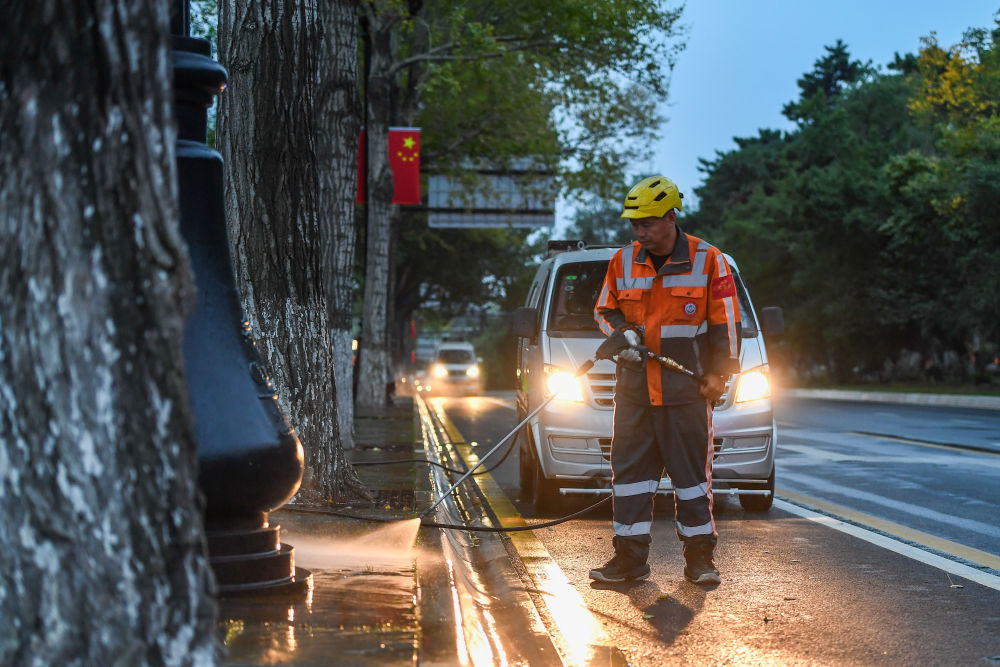 10月1日,環(huán)衛(wèi)工人在吉林省長(zhǎng)春市朝陽區(qū)新民大街清掃人行步道。新華社記者 張楠 攝