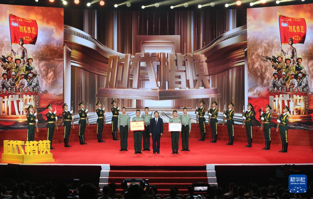 在“時代楷模”發(fā)布儀式上,陸軍某合成旅合成二營裝甲步兵一連(“劉老莊連”)官兵代表領(lǐng)取“時代楷?!豹勁坪妥C書(9月29日攝)。新華社發(fā)(華夏 攝)