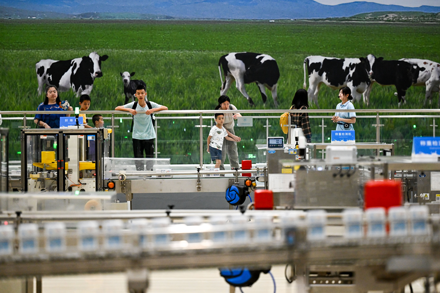 2025年7月28日,游客在呼和浩特市伊利現代智慧健康谷液態(tài)奶全球智造標桿基地參觀。新華社記者 李志鵬 攝