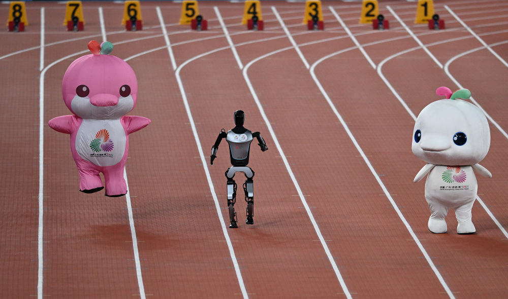 11月17日,在田徑項(xiàng)目賽事開始前的暖場活動(dòng)中,機(jī)器人和吉祥物喜洋洋、樂融融在廣東奧體中心體育場賽跑。新華社記者 周牧 攝
