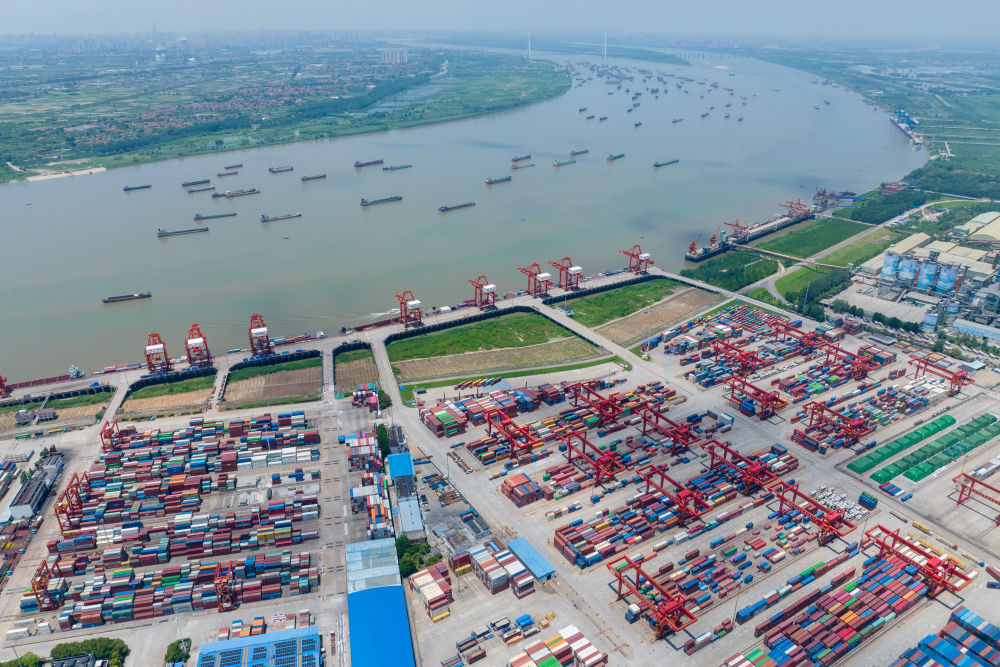 2023年7月5日拍攝的武漢陽(yáng)邏港一期碼頭(無(wú)人機(jī)照片)。