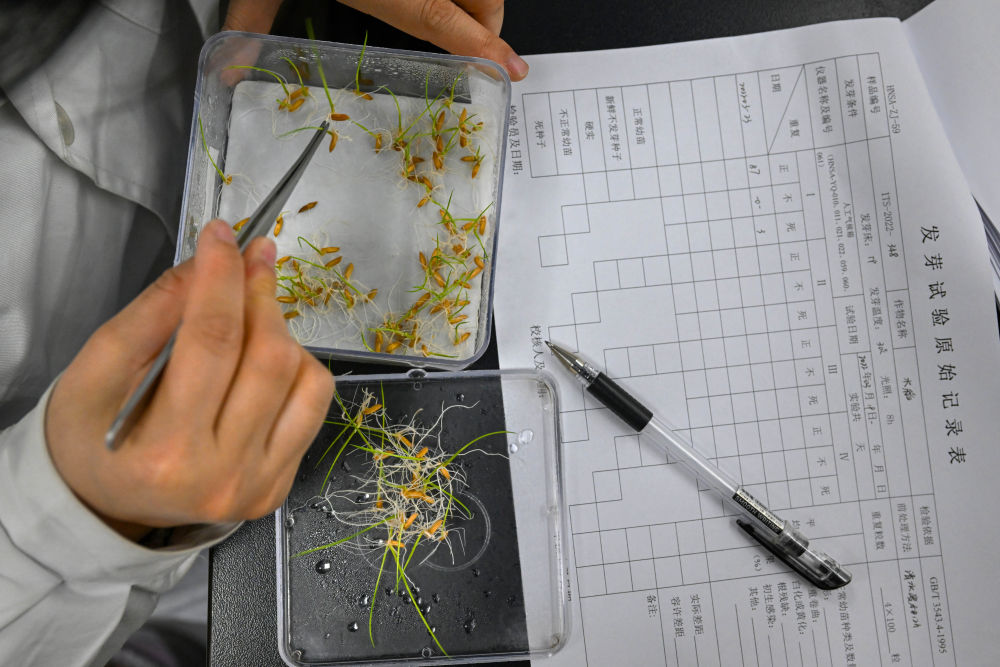 2022年3月23日,在湖南省農(nóng)作物種質(zhì)資源庫(kù)實(shí)驗(yàn)室,檢測(cè)員對(duì)保存的水稻種子進(jìn)行發(fā)芽試驗(yàn)檢測(cè)。