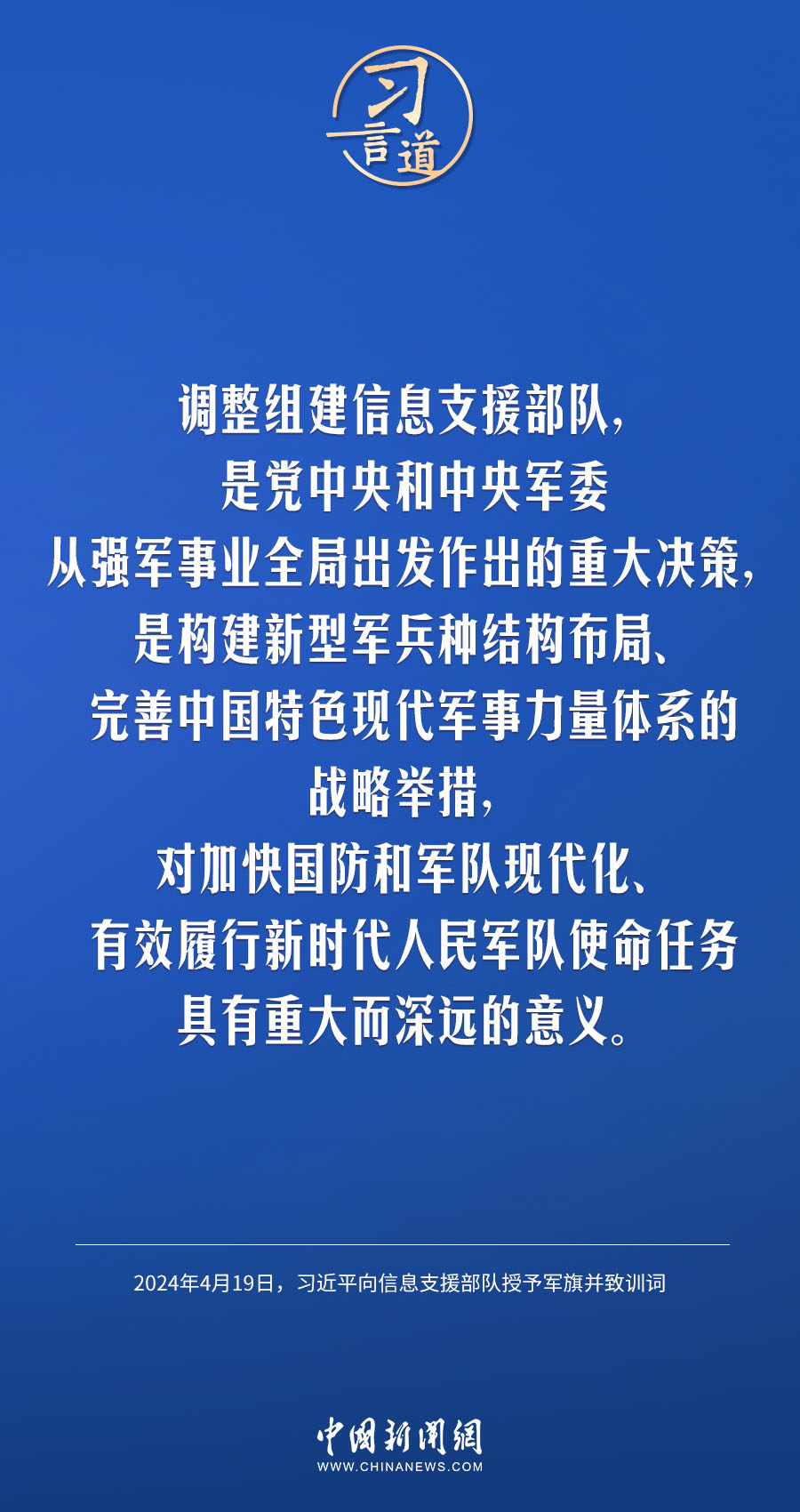 中國人民解放軍信息支援部隊成立大會19日在北京八一大樓隆重舉行。中共中央總書記、國家主席、中央軍委主席習近平向信息支援部隊授予軍旗并致訓詞,代表黨中央和中央軍委向信息支援部隊全體官兵致以熱烈祝賀。他強調(diào)——