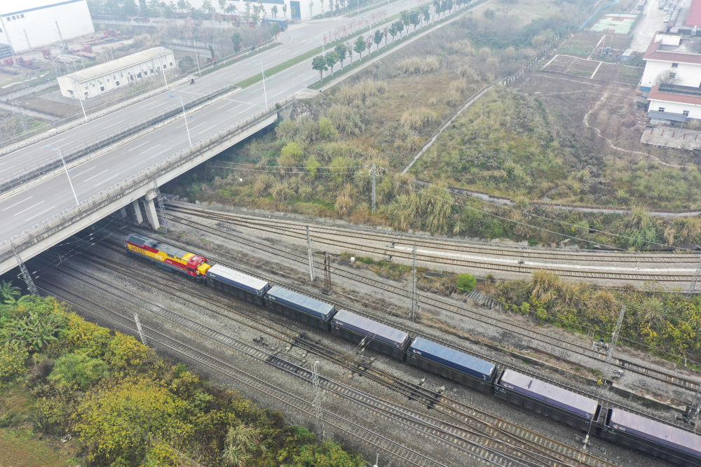 2023年1月22日,一趟西部陸海新通道鐵海聯(lián)運(yùn)班列從重慶團(tuán)結(jié)村中心站發(fā)車(無人機(jī)照片)。班列滿載著汽車、摩托車、發(fā)動(dòng)機(jī)和純堿等共計(jì)100個(gè)集裝箱的貨物,將經(jīng)廣西欽州港換乘海船去往印度尼西亞、菲律賓、喀麥隆、澳大利亞等國家和地區(qū)。