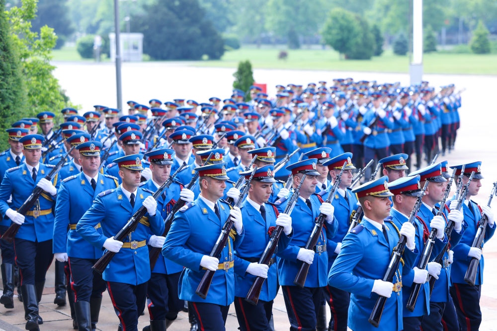 塞爾維亞大廈前,中塞兩國國旗迎風(fēng)飄揚(yáng),儀仗隊威武雄壯。