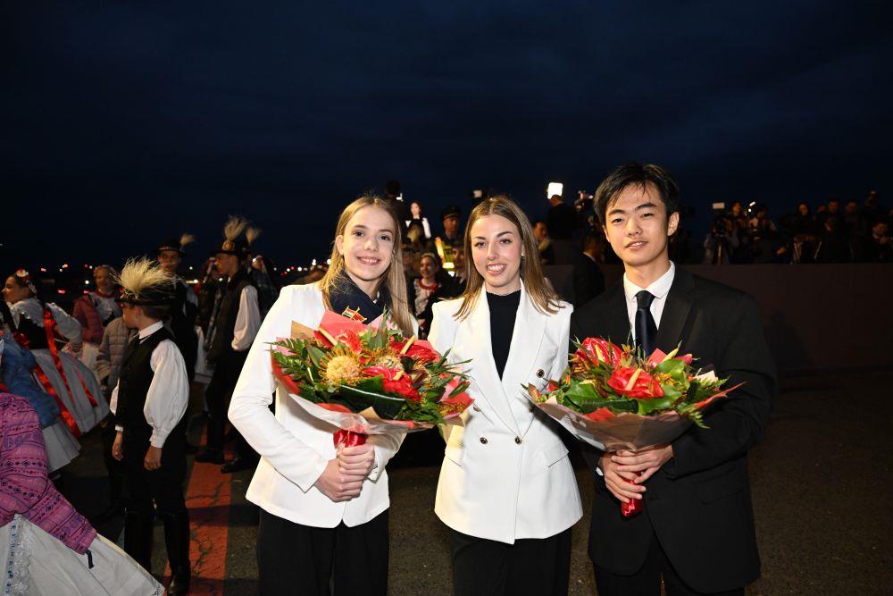 當(dāng)?shù)貢r間5月8日晚,在匈牙利布達佩斯國際機場,匈牙利姑娘歐拉·塔瑪拉(中)與匈中雙語學(xué)校兩名參加歡迎儀式的學(xué)生合影。