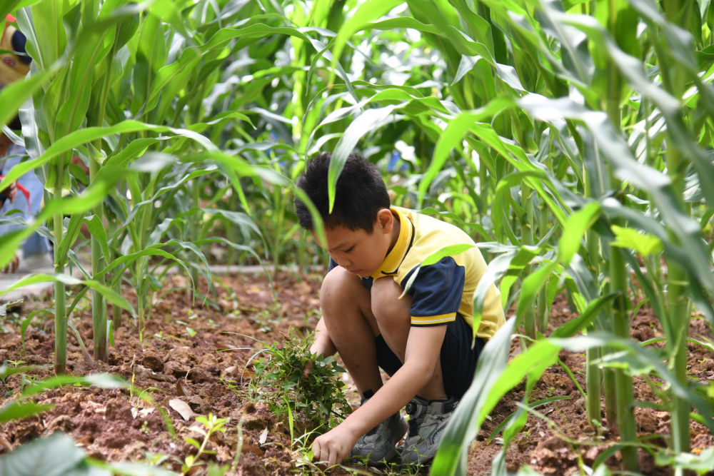 5月31日,學(xué)生在之江小學(xué)勞動實踐基地除草。