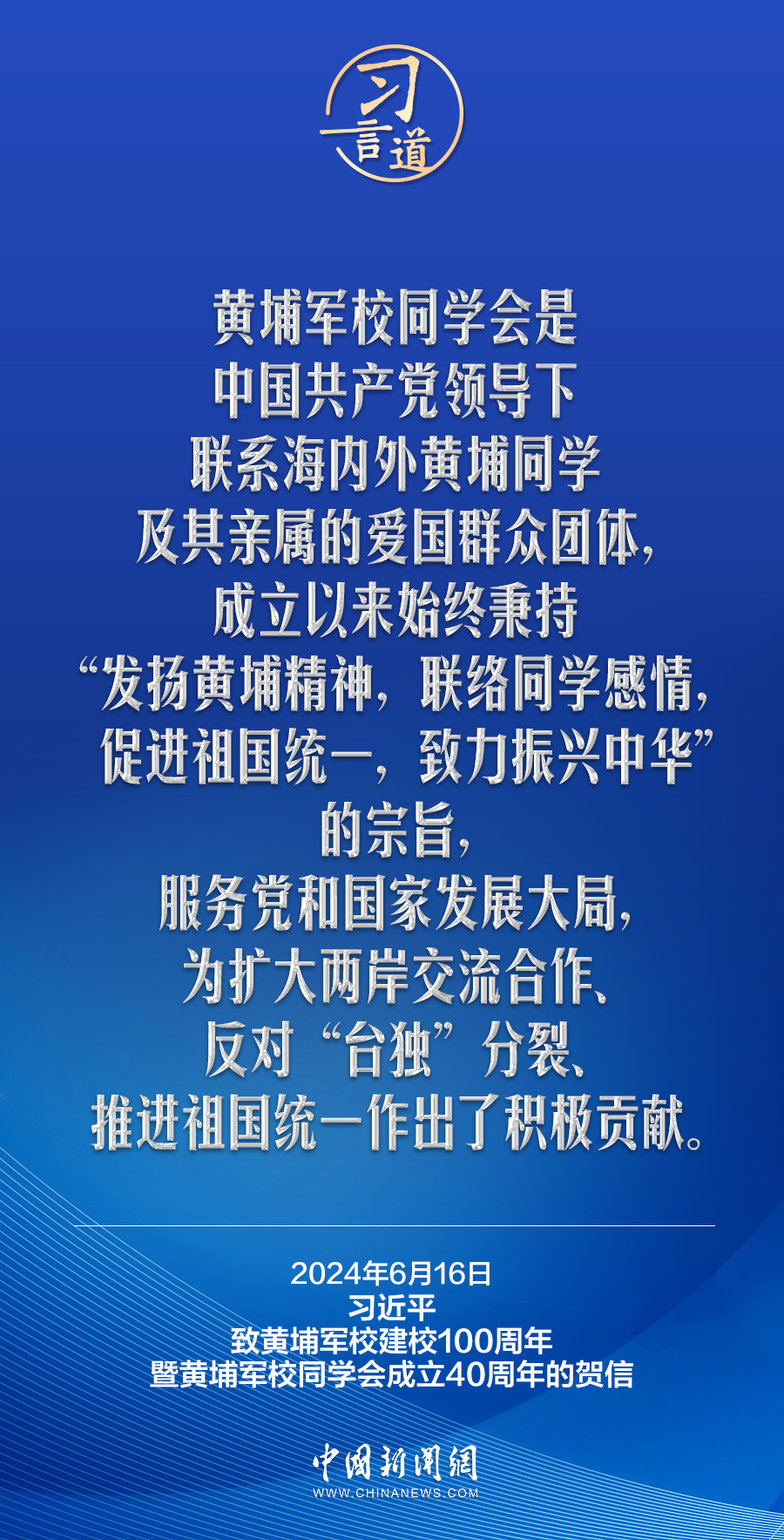 在黃埔軍校建校100周年暨黃埔軍校同學(xué)會(huì)成立40周年之際,中共中央總書記、國(guó)家主席、中央軍委主席習(xí)近平發(fā)來賀信,代表中共中央向黃埔軍校同學(xué)會(huì)表示熱烈祝賀,向廣大海內(nèi)外黃埔同學(xué)及其親屬致以誠(chéng)摯問候。習(xí)近平指出——
