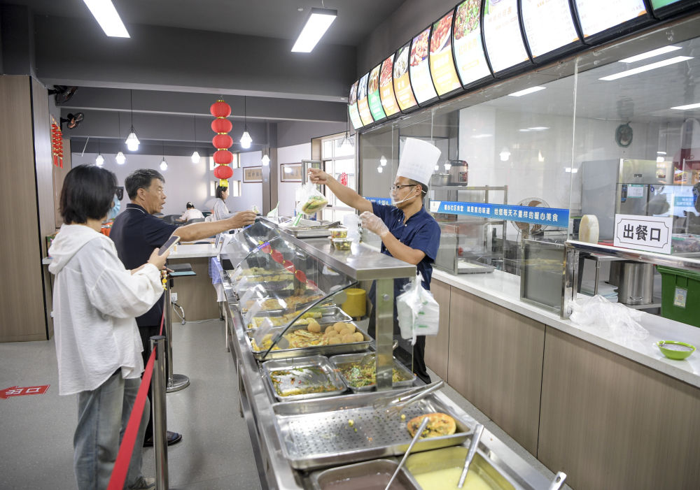 6月20日,寧夏銀川市金鳳區(qū)長(zhǎng)城花園社區(qū)居民在社區(qū)食堂買早餐。