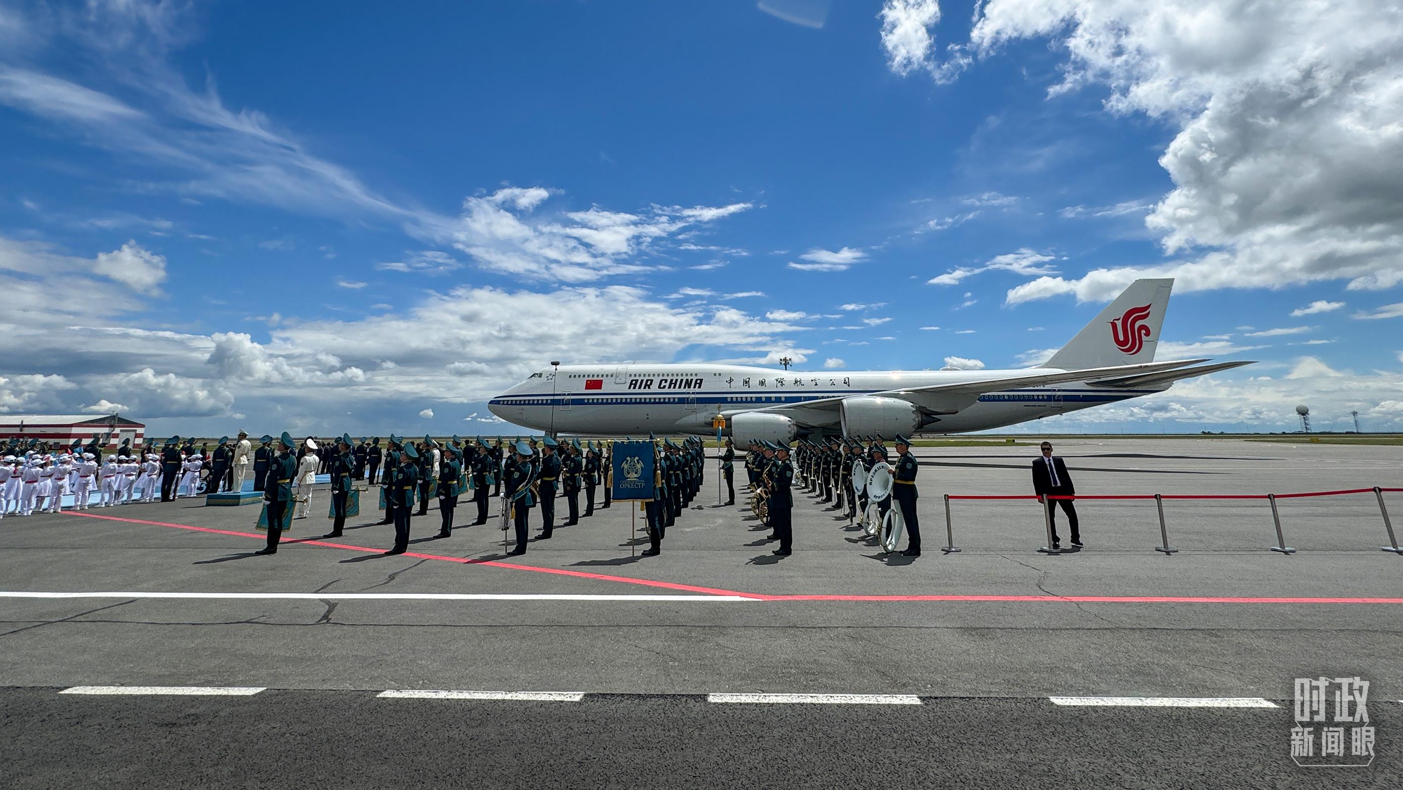 當(dāng)習(xí)近平主席乘坐的專機(jī)進(jìn)入哈薩克斯坦領(lǐng)空時(shí),哈薩克斯坦三架空軍戰(zhàn)機(jī)升空護(hù)航。專機(jī)抵達(dá)阿斯塔納納扎爾巴耶夫國際機(jī)場時(shí),托卡耶夫總統(tǒng)率政府第一副總理等高級官員熱情迎接。