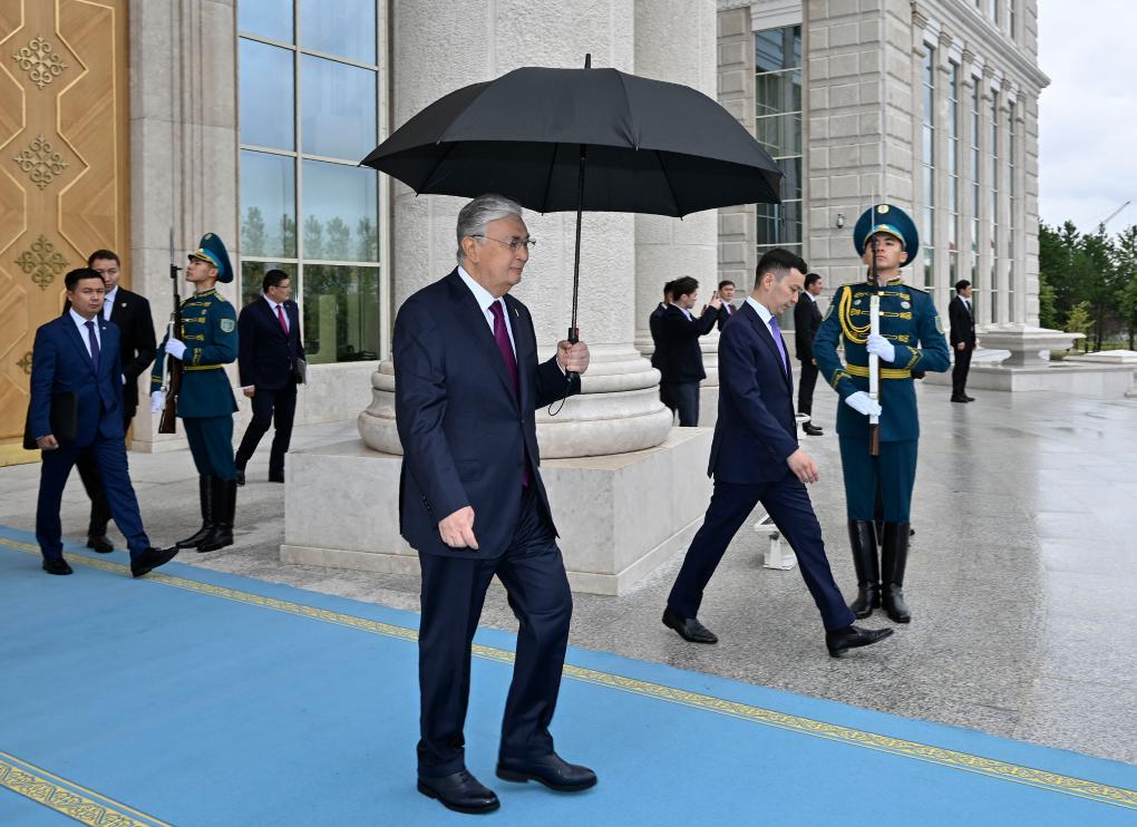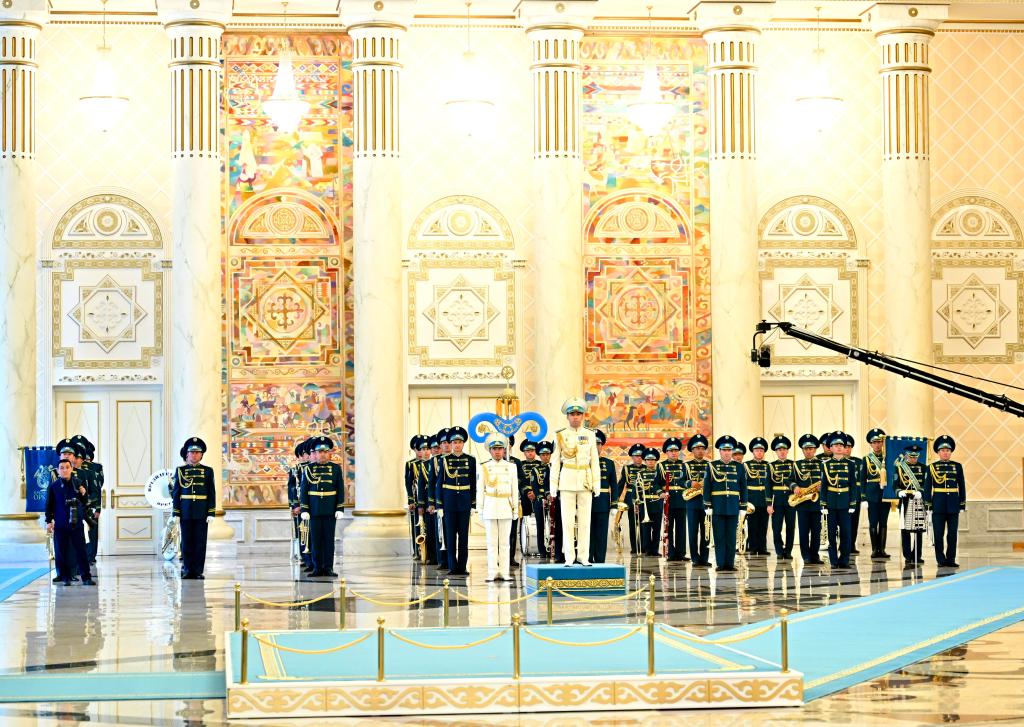 托卡耶夫?yàn)榱?xí)近平舉行隆重歡迎儀式。總統(tǒng)府大廳氣勢恢宏,禮兵威武挺拔。兩國元首分別同對方陪同人員一一握手致意。兩國元首登上檢閱臺,軍樂團(tuán)奏中哈兩國國歌。習(xí)近平在托卡耶夫陪同下檢閱儀仗隊(duì)。