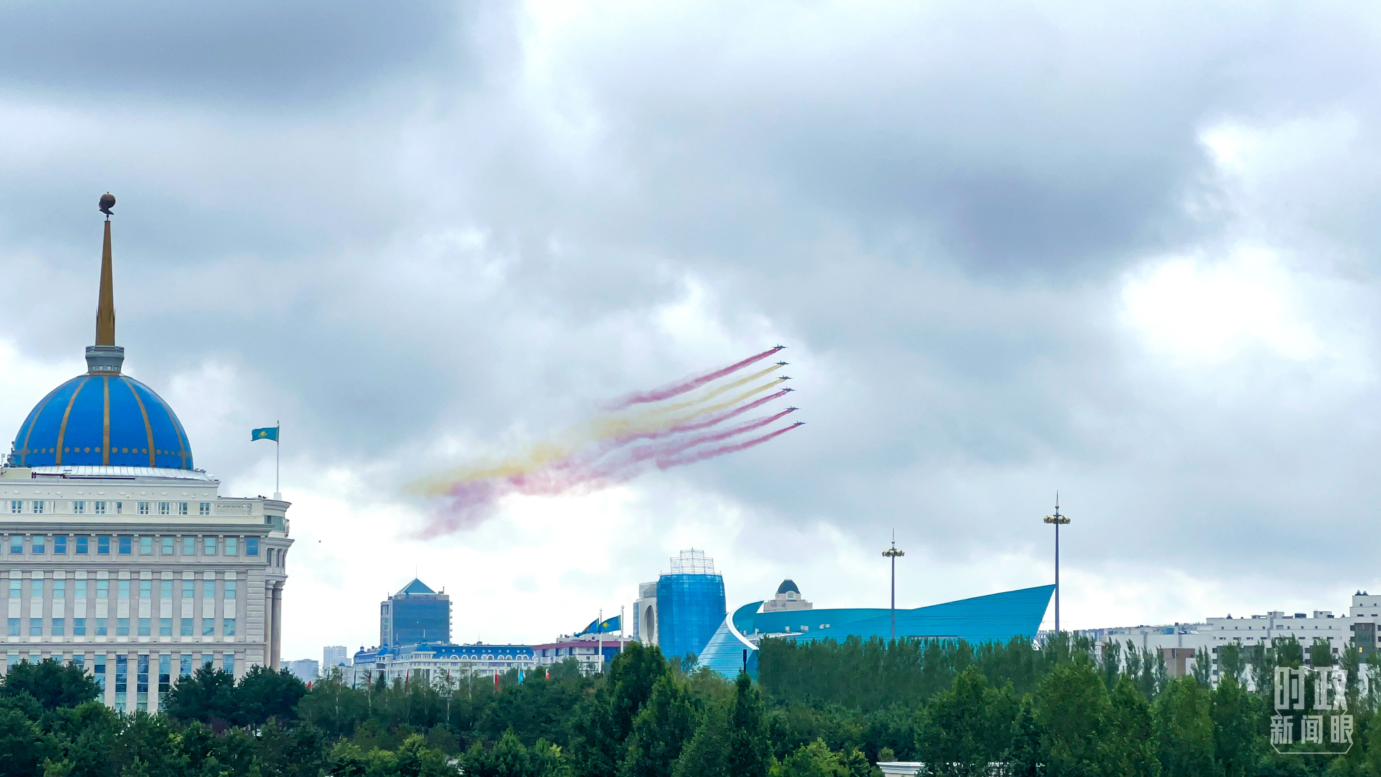 習(xí)主席乘車抵達哈總統(tǒng)府時,托卡耶夫總統(tǒng)熱情迎接。六架哈薩克斯坦空軍戰(zhàn)機從總統(tǒng)府上空飛過,拉出象征中國國旗色彩的紅黃色彩煙,以最高禮儀歡迎中國貴賓。