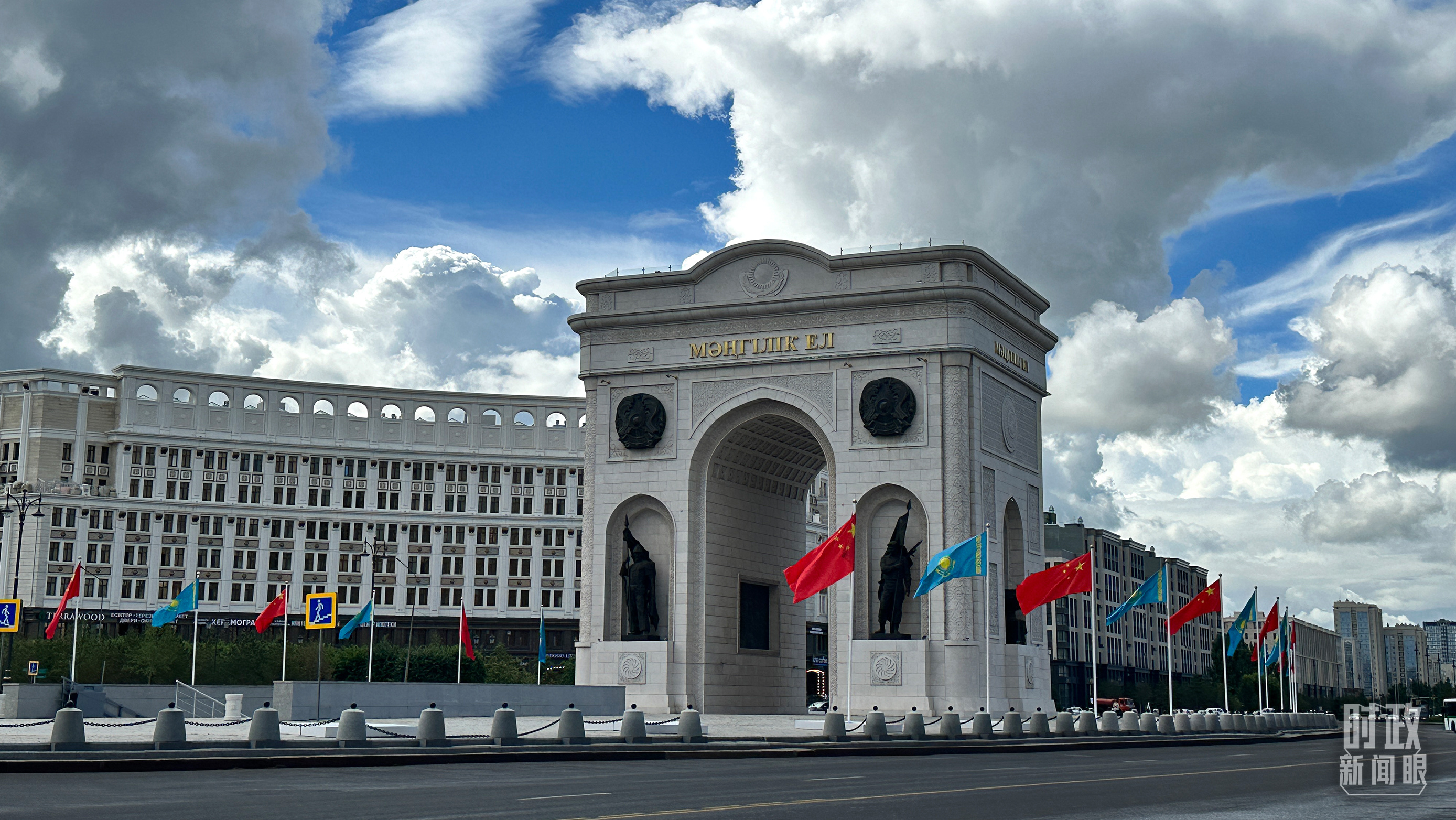 阿斯塔納地標(biāo)建筑“凱旋門”兩側(cè),中哈兩國國旗迎風(fēng)招展。(總臺央視記者關(guān)舟拍攝)