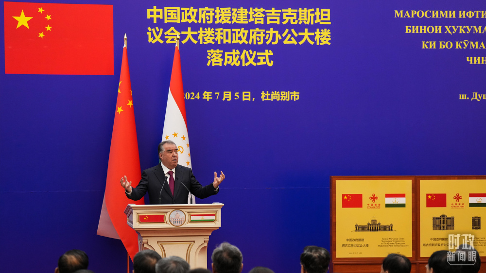 5日,拉赫蒙總統(tǒng)陪同習(xí)主席共同步入議會大樓。兩國元首參觀中方援塔議會大樓和政府大樓項(xiàng)目展板,共同為兩座大樓揭牌。