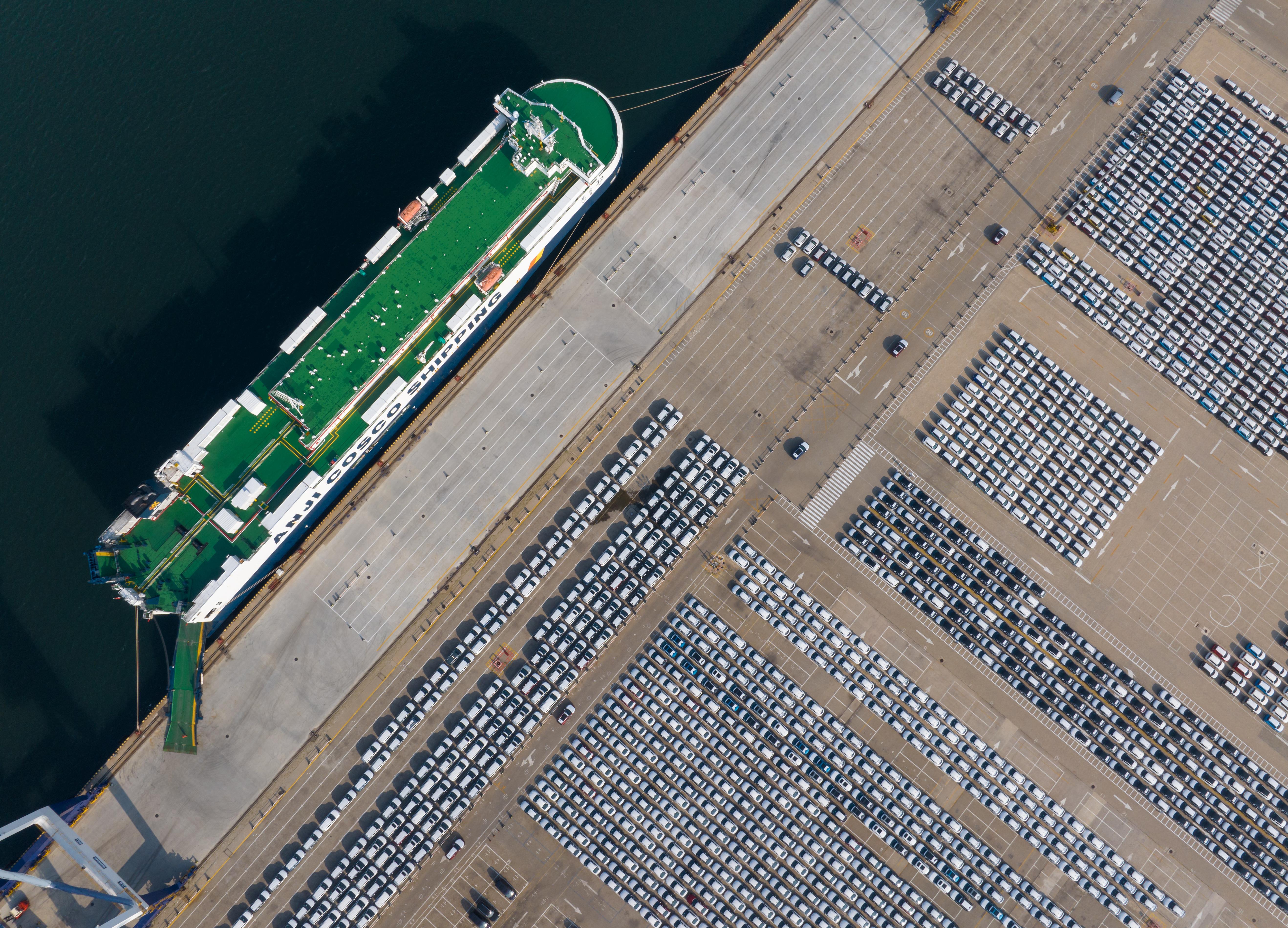 2024年7月11日,山東煙臺,出口的新能源汽車在煙臺港專用碼頭整裝待發(fā)。