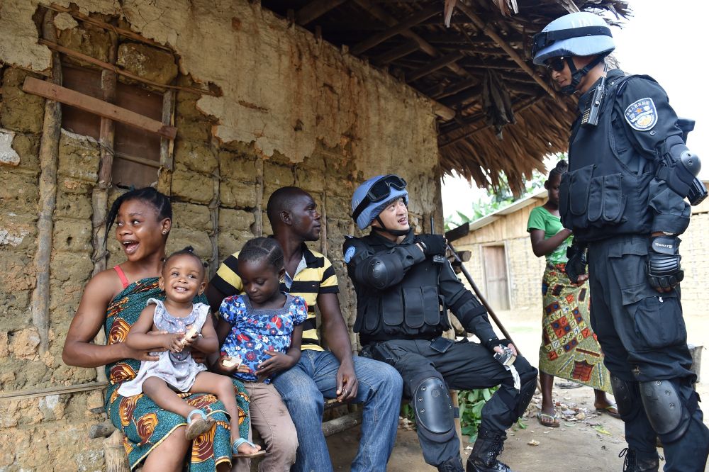 2015年11月3日,在利比里亞格林維爾一座村莊,中國(guó)維和警察防暴隊(duì)隊(duì)員詢(xún)問(wèn)近期治安等情況。